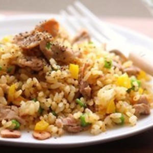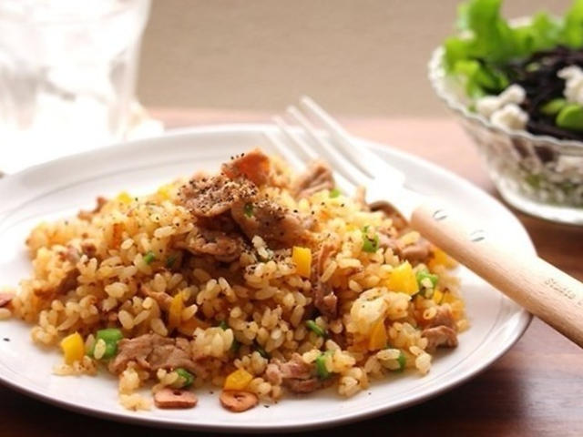 ビタミンB1が豊富な豚肉とにんにくを組み合わせたスタミナチャーハンにさっぱり味のひじきサラダをつけた献立です♪