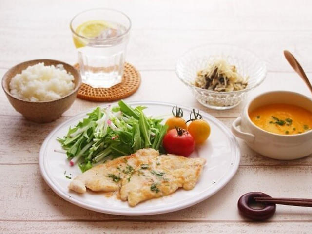 ダイエットでは、「バター」というと何となく敬遠しがち。でも、コクがあって、風味も良く、是非、楽しんで欲しい食材のひとつでもあります。今回は、低脂肪な鶏ささみと組み合わせることで、バターの風味も楽しみつつ、しっかりダイエットに繋がるような献立に。不足しがちなカルシウムも簡単に補給できるポタージュスープや、もずくの和え物も添えて、代謝アップにつながるような献立です。スープは冷やしてもおいしいですよ。