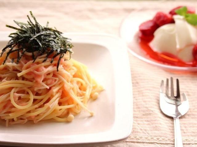 メインのパスタの半分はえのきたけ。カロリーを抑えられるだけでなく、食物繊維もたっぷり摂れます。また、魚介類の中でもとくにビタミンB1が豊富なたらこを使用しているので、疲労回復にも効果的。粉チーズでカルシウムもたっぷり摂れます。デザートにはビタミンCの豊富ないちごとカルシウムたっぷりのヨーグルトを使ったプリンを添えて。1コンロで出来る栄養満点レシピです。