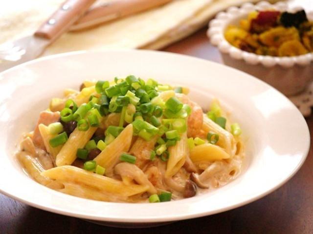 秋鮭やきのこ、さつまいもにかぼちゃと秋の味覚をふんだんに使用した献立。高脂肪になりがちなクリームパスタは、牛乳と薄力粉を使うことによって、濃厚さを保ちつつ、低脂肪、低カロリーに仕上げました。また、献立中に豊富に使用している秋の味覚、きのこやさつまいも、かぼちゃは食物繊維が豊富。食物繊維は腸内環境を整えて、便秘改善、痩せやすい身体づくりも助けてくれます。