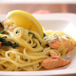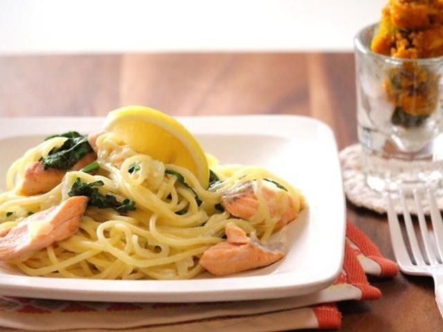 炭水化物のパスタとたんぱく質の鮭と、野菜の春菊を組み合わせたバランスの良いパスタに、肌にうるおいを保つビタミンAやEを多く含むかぼちゃのアーモンド和えを組み合わせた献立。かぼちゃはお肌にも良いけれど、炭水化物も多いのでパスタの量は少なめに調整しています。また、旬の春菊や牛乳には不足しがちなカルシウムもたっぷり♪ダイエット中にイライラしがち・・・そんな方にもお勧めな献立です。