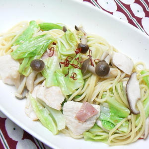 ぶなしめじ、えのき、しいたけなど、ヘルシーで旬のきのこたっぷりのパスタです。満腹感も◎皮なし鶏胸肉でカロリーダウン&栄養価もアップ♪味付けはシンプルなペペロンチーノですので、調理も簡単です。キャベツも使いまわして簡単スープに。