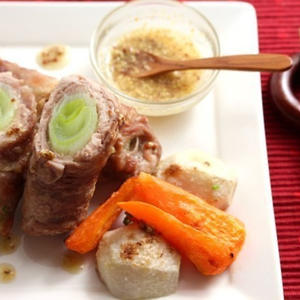 長ねぎを巻いて食べごたえ満点!加熱した長ねぎの甘みも広がり、うま味もプラスしました。また、ご飯にも良く合う一品です。ビタミンやミネラル豊富な小松菜の副菜も添えてどうぞ。
