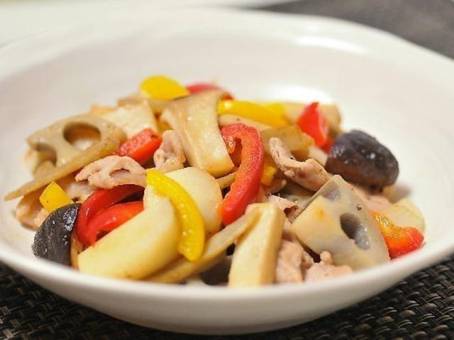 ご飯によく合う甘酢味で、豚肉とたっぷりの野菜を炒めました。ごぼうやきのこ類などの食物繊維豊富なお野菜を使い、食物繊維もたっぷり摂れちゃいます♪
