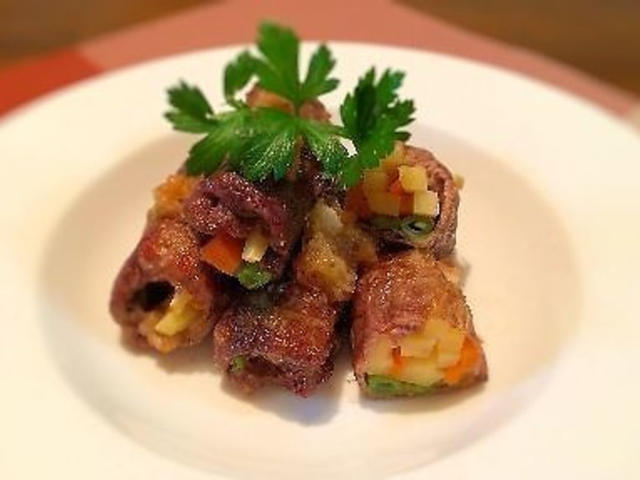牛肉に様々なお野菜をたっぷり巻いて、ボリューム&食べごたえ満点!普段野菜不足が気になる方にもオススメな一品です。醤油ベースのタレは、玉ねぎやにんにくの香りが加わり美味しさも◎