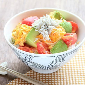 フライパンひとつでささっと調理出来ちゃう簡単どんぶりです♪旬のトマトとアボカドの組合せは美肌やアンチエイジングに最適♪暑くて長い時間火の前に立ちたくない日や、夜遅く帰った日のご飯にオススメです。