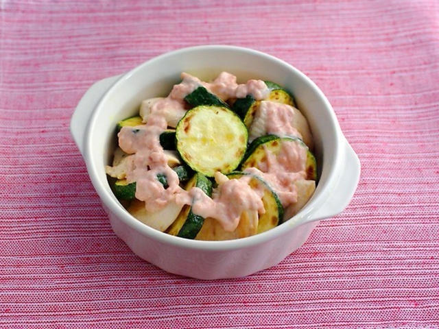 ズッキーニを使用した何とも低カロリーなメニューです。低糖質のため、糖質制限やダイエット中の方にもぴったりな食材ですね。梅肉ソースの酸味がきいて食べやすく、美味しさも引き立ちます。