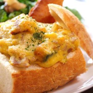 くり抜いたパンにかぼちゃのシチューが華やかな、見た目にもおしゃれでかわいい一品です。なめらかで甘みを感じるシチューにパンはもちろん相性抜群♪朝食やランチ、ちょっとしたパーティーにもオススメです。