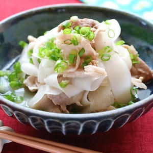 ピーラーで切って火の通りを早くし、見た目もひらひらとかわいい大根と、塩こうじを揉み込んだやわらかい豚肉を、お鍋でさっと煮るだけの簡単調理が嬉しい一品です。かつおだしと塩こうじだけで味付けした優しい和食の出来上がりです♪里芋の小鉢や水菜と厚揚げのお味噌汁、デザートにキウイを添えてどうぞ♪