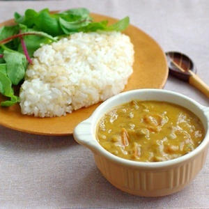 お肉を使わず、レンズ豆と豆乳とお野菜で作ったヘルシーカレーですので、お肉が苦手な方にもさっぱり食べやすく、オススメです。お豆+お野菜で食物繊維がたっぷり♪ダイエット中の便秘解消にも!