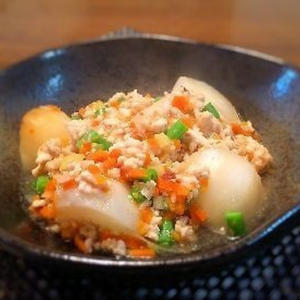 柔らかく甘い旬のかぶを、鶏ひき肉とたっぷりのお野菜と一緒に煮た、ほっとする和風おかずです。まだ肌寒いこの季節にぴったりな、とろっと冷めにくいあんかけ風です。シャキシャキ歯ごたえの水菜の簡単漬けや、噛みごたえ満点な根菜のお味噌汁をそえて、ほっこり和食をどうぞ♪