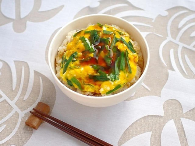 香り豊かな柔らかい春にらと、栄養満点なたまごを使った、ふわふわあんかけ丼です。レンジで調理できちゃいますので、調理も簡単♪香ばしく焼いた野菜の香りのサラダや、春野菜をたっぷり使ったお味噌汁も添えてどうぞ。