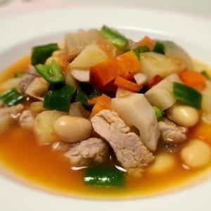 たんぱく源である豚肉や大豆、緑黄色野菜のニンジン、トマト、ピーマンを含むたっぷりのお野菜、エネルギー源である糖質を多く含むジャガイモやレンコンも入っていますので、これ1杯で栄養バランスの良いお食事になりますよ☆ 遅くなってしまった日の夕食、忙しい朝にはこれ1杯でOKです!薄味に仕上げて、スープに溶け込んだ栄養も余すことなく摂りましょう!
