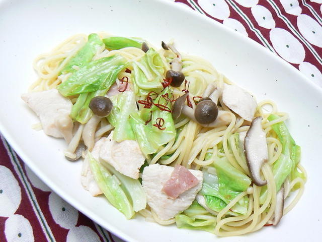 キャベツの甘みを堪能♪チキンとキャベツ、きのこのパスタ