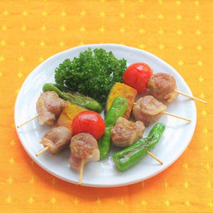 豚肉を綺麗な彩り野菜と一緒に串焼きにすることで、物足りなさを感じにくくする工夫をしています。豚は塊肉ではなく、薄切りを丸めて使うことでジューシーに柔らかく仕上がりますよ。