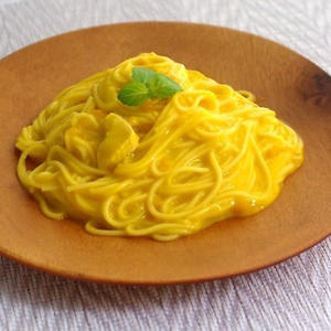 かぼちゃのキレイな黄色を生かしたクリームパスタ、バターや生クリームは使用せず牛乳とコンソメで仕上げてあるのでとてもヘルシーですよ。かぼちゃの自然な甘みが生かされた優しいパスタをぜひお楽しみください♪