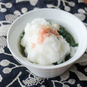 かつお出汁を使った豆腐と油揚げの煮物はホッとする優しい味わいです。豆苗はすぐに火が通るので、色合いや食感を保つためにも加熱し過ぎないのがポイントです。お好みで七味唐辛子を掛ける事で味のアクセントになりますよ。ふわふわの卵白がオシャレなほうれん草の淡雪スープや、サツマイモと人参の甘辛煮を添えてどうぞ。