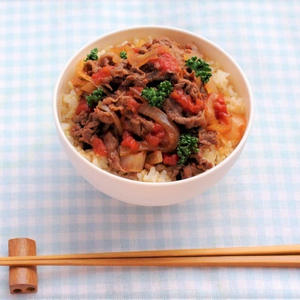 牛肉には筋肉の材料となるたんぱく質が豊富に含まれています。脂肪分が少ないもも肉を選択すると、カロリーを抑えられます。抗酸化作用のあるリコピンや、美肌に良いビタミンCなどの栄養素が豊富に含まれているトマトと組み合わせることでより栄養バランスが整いますし、ご飯少なめでも満足感のある丼メニューになります。