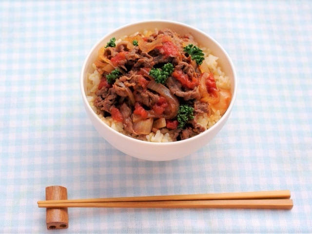 トマト缶を使って洋風に仕上げた牛丼です。牛丼はこってりとした味付けのイメージですが、トマト缶を加える事でトマトの酸味が加わりサッパリと食べやすいお味になります。トマトの赤色とパセリの緑で見た目も華やかに☆ほうれん草の白和えとネバネバ食材を使ったマスタード和えを添えて召し上がれ。