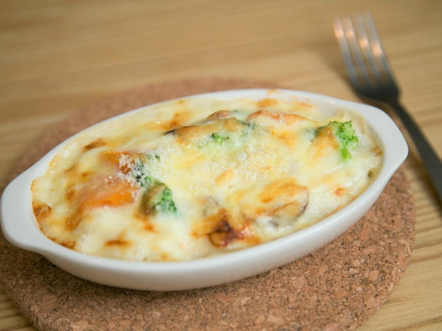 シチューをご飯にかけて焼くだけで、簡単にドリアの完成です。市販のルウには油脂がたくさん含まれていますので、高カロリーになりやすいです。小麦粉から作るシチューは美味しくてヘルシーです。また、副菜にはビタミン・ミネラルが豊富に含まれる水菜と豆苗のサラダを付け、栄養バランスを整えました。