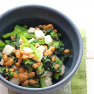 雑炊は1品でも主食・主菜・副菜を揃えやすいのでバランスも整えやすいメニューです。こちらのレシピは準備も簡単なきのこ類を使用するので時短での調理も可能ですよ。レンジで加熱して和えるだけの小松菜と納豆のねばねば和え、水切りしたヨーグルトにお手軽コンポートを合わせ、忙しい朝の時間帯にも手軽に調理、栄養補給でき、食べやすさにもポイントを置いた献立です。