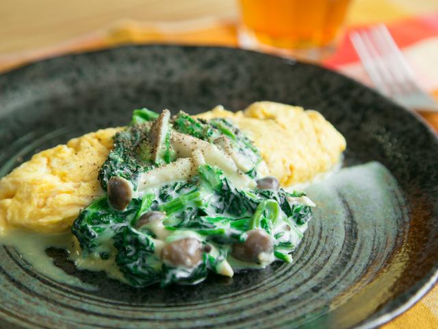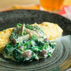 ほうれん草やしめじを使った具だくさんなクリームソースをかけた、ボリュームのあるオムレツです。とろとろのクリームソースとふわふわなオムレツは相性抜群!カボチャとレンコンを使ったビタミン豊富なグリルサラダやシンプルなプチトマトのスープを添えてどうぞ。