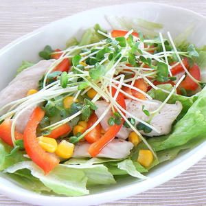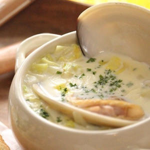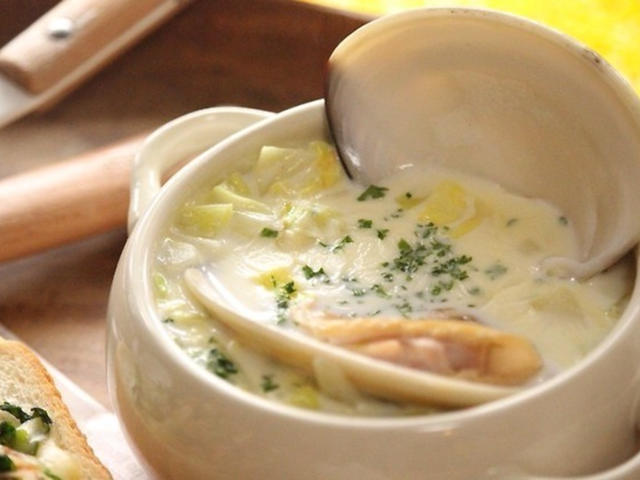 はまぐりや春キャベツ、新玉ねぎなど旬の食材をたっぷり使ったスープが今日の主役です。旬の野菜は甘みがあっておいしいですよね。フランスパンと一緒に召し上がってくださいね。スープだけでは物足りないので、チキンを使ったボリュームのあるサラダとフルーツも組み合わせた献立です。