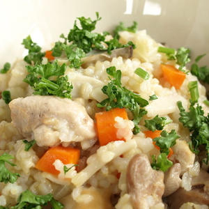 玄米が苦手な方でも、リゾットにする事で食べやすくなるのでおすすめです♪良質なたんぱく源である鶏肉や食物繊維が豊富なエリンギなど、具だくさんで満足感のある1品となっています。また鶏肉は皮なしにするだけでも脂質やカロリーをカットできるので、ダイエット中の方は意識してみて下さいね!