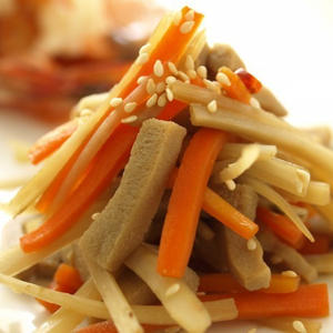 海藻類であるわかめと春が旬の筍は「若竹煮」でも良いコンビです。今回は煮るよりも手軽にできる若竹炒めのご紹介です。豚肉も入ると全体がよりまとまってメインメニューにぴったりです♪ 春ごぼうを使用したきんぴら、アスパラガスなどの春野菜とピンク色の桜えびを使用したお味噌汁と一緒に、春ならではの食材を楽しめる献立です。
