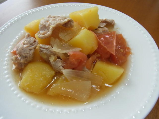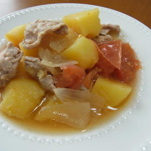 定番の肉じゃがにトマトをプラスしさっぱりと仕上げています。トマトの旨みがあるので塩分は控えめです。肉じゃがは糖質が多いのでごはんは少なめの100gにしています。サラダや汁、肉じゃがから食べるとごはんの量が少なくても満足感を得やすくなりますよ☆