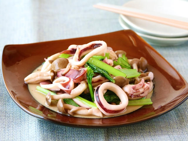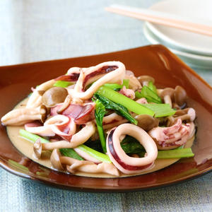 低脂質、高たんぱくのイカは肥満予防にぴったりな食材。しかしどうやって料理に使うのか悩んでしまうことがあるかもしれませんね。このレシピはバターで炒めてめんつゆで味をつけるだけなので手軽にイカを料理に使うことができます。簡単な副菜2品と組み合わせ、バランスの良い一汁三菜の献立になっています。