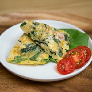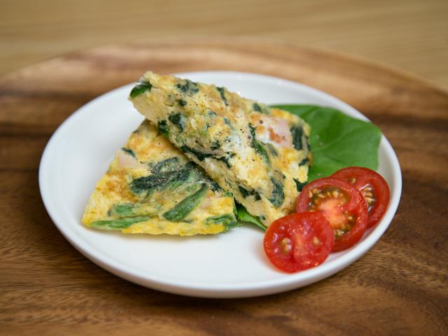 ほうれん草やハムなど、たっぷりの具材を加えた具だくさんオムレツがメインの献立です。コクのある粉チーズやハムなどを使う事でしっかりと味がつくので、何もつけなくても美味しい一品となりますよ。彩りも綺麗なのでお弁当のおかずとしてもオススメです。