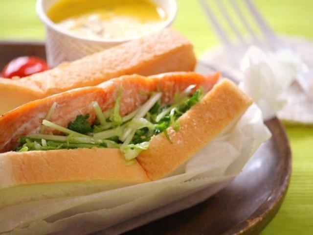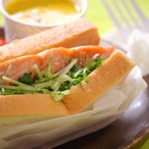 グリルで焼いた香ばしい鮭と野菜がたっぷり食べられるサンドイッチ。オリーブオイルのコクと香りが食材を上手くまとめてくれていますよ♪ トマトとパプリカを使用したカラフルなスープ、かぼちゃプリンを添えて朝食にも食べやすいメニューです☆