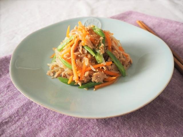 しらたきと人参のツナ炒めがメインの献立です。しらたきは低カロリーなので、お料理に取り入れる事でカロリー控えめでも満足感のある一品に仕上がります。 また、しらたきは食物繊維が豊富に含まれていますので、血糖値の上昇を緩やかにしたり、便通を整える効果が期待できます。ツナ缶を使う事で旨味もプラスされますよ。