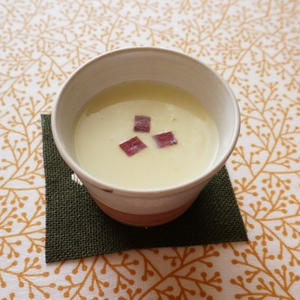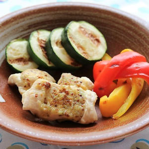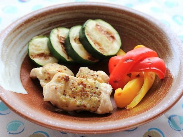 ささみにマスタードマヨネーズを塗って焼くだけの、簡単料理が今日のメイン。彩り豊かな夏野菜を添えることで、華やかに仕上がります。水菜とベーコンのサラダ、さつまいものポタージュと組み合わせた洋風な献立です。さつまいものポタージュはルウではなく、片栗粉でとろみをつけているので低カロリーですよ。