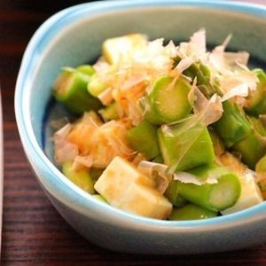 魚が一緒に食べられる身体に嬉しいちらし寿司です。手間がかかるイメージもあるそぼろは、味噌煮の缶詰を使用することで味も決まりやすく、ほぐしやすいことも嬉しいポイントです。紅生姜の赤、卵の黄色、大葉の緑色と彩りもキレイなちらし寿司です。 アスパラガスと枝豆をチーズで和えた和え物、具材が豊富に入ったコクのある豚汁、キウイフルーツと合わせてどうぞ♪