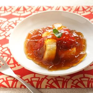 おいしいだし汁を吸い込んだがんもどきを主役に。あんかけで一緒に副菜も食べやすく工夫したメニューです。 大根のツンと辛味もある蒸し鶏と豆苗のおろし和え、こんがりと焼いて野菜の旨味を引き出したすまし汁、寒天の中から果物が出てくるサプライズデザートと一緒にお召し上がりください♪