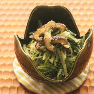 一年中出回っている鮭は食卓に登場する回数が多いかもしれませんが、こんなアレンジはいかがでしょう。旬の茄子と一緒にみぞれ和えにし、ごま油やポン酢で味をつけてコクがあるのでごはんが進む一品です!カルシウムが豊富な水菜の和え物ともやしのピリ辛スープと一緒どうぞ。