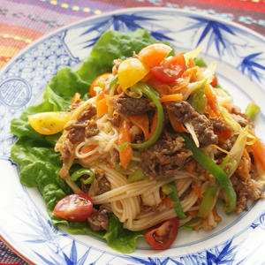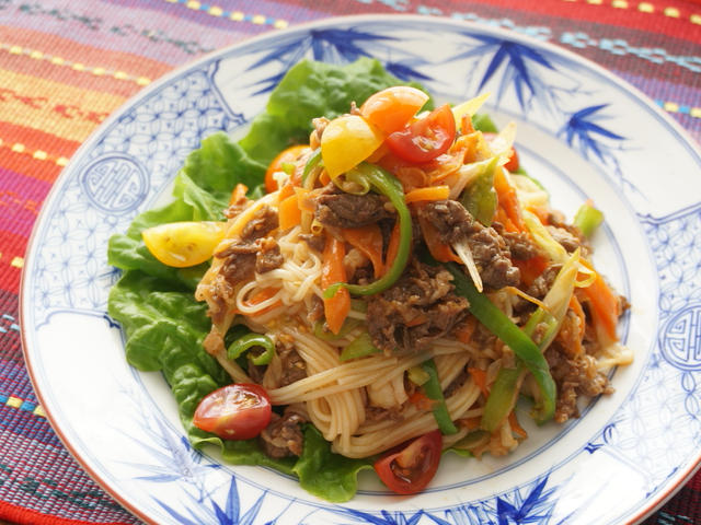 ランチにおすすめ☆牛肉とそうめんのチャプチェ風酢トマトのせ