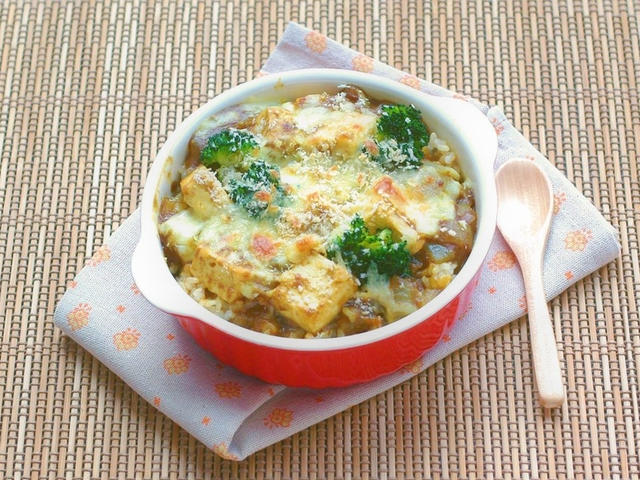 豆腐を使った焼きカレーです。お肉の代わりに豆腐を使用することで、カロリーを抑えることができるので、ダイエット中の方にもおすすめです◎レンジを使っているので、手軽に仕上がりますよ!また豆腐に含まれている大豆サポニンには、コレステロールを体に吸収しにくくなるように抑え、数値を安定させる効果が期待できます。
