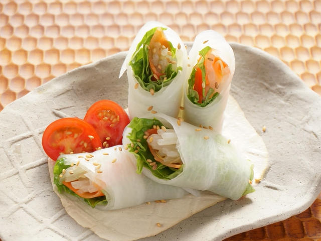 生春巻きの皮を大根で代用した、ヘルシーな1品です。中に入れる野菜を茹でてカサを減らす事で、不足しがちな野菜をしっかりと摂取する事が出来ます。彩りも鮮やかで、食卓が華やかになりますよ♪全体的にあっさりとした献立となっておりますので、暑くて食欲が出ない時期にもおすすめです◎