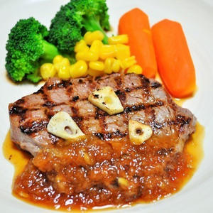 にんにくの香りも引き立ち食欲そそるステーキです。ソースに加えたレモン汁がさっぱりとした後味にしてくれますよ。 副菜と汁物はステーキを引き立ててくれる組み合わせになっています。デザートには梨を添えてどうぞ。