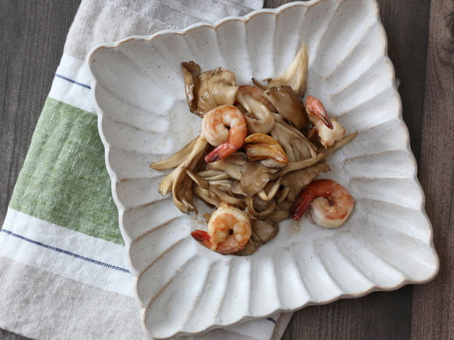 低脂質のエビと舞茸の組み合わせですが、ガーリックの風味とオイスターソースでしっかりと味をつけることで食べ応えはしっかりあります。エリンギやしめじなどお好みのきのこをプラスするのも良いですね。