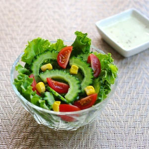食感がなめらかでクセの少ない味のお豆腐はカレーとも好相性。焼き野菜も添えてヘルシーに食べられるカレーには、ゴーヤの苦みを豆乳のドレッシングがまろやかにしてくれるサラダ、爽やかな酸味のキウイフルーツを組み合わせてお楽しみください。