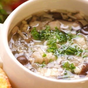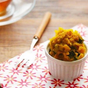 ガーリックの食をそそる香り、エビの旨味、黒こしょうのピリッと後味で簡単に食べやすいメニューです。 カリッとベーコンの旨味がアクセントのサラダ、デザート感覚で食べられる秋にぴったりの和え物、きのこのスープと合わせて風味豊かな食材や特徴ある調味料を活用した献立です。