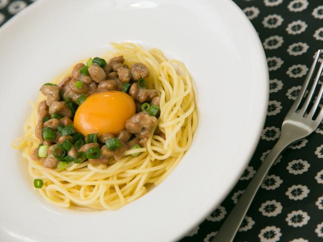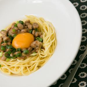 パスタソースを作らずに、茹でたパスタに具材をのせるだけの簡単調理!さらに味付けにはめんつゆを使用しているのであっという間に作れます。めんつゆと納豆、卵黄がパスタに絡みおいしいですよ。
