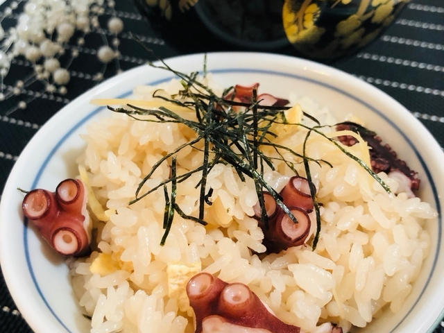 ぷりぷりのタコがおいしい炊き込みご飯です。タコは脂質が少ないので低カロリー。また、歯ごたえがあるので食べ過ぎの予防にもなりますね。タコに含まれるタウリンは血圧を正常に保つ働きなどがあり、生活習慣病の予防に効果があるとされています。
