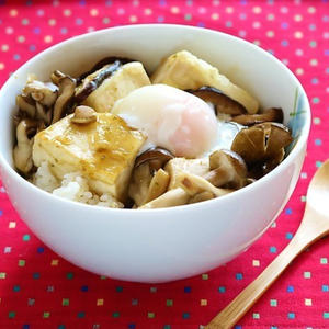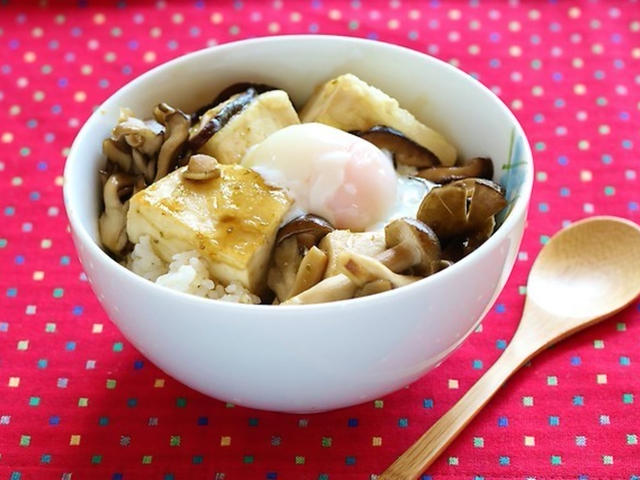 こんがり焼いた、豆腐とキノコの柚子胡椒照り焼き丼