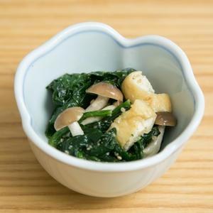 こんがりと焼いた豆腐と温泉卵のどんぶりはヘルシーながら食べ応え満点!甘辛味に柚子胡椒がピリっとアクセントになっています。副菜のごま和えはレンジで作れるので、忙しい時にもおすすめです。