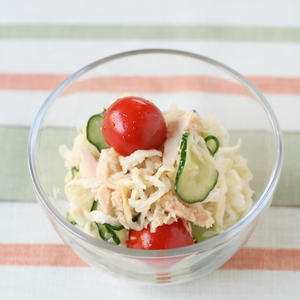 長芋をつなぎにも利用して生地のもっちりふんわり感、キャベツのシャキシャキ感を楽しめるお好み焼きです。切り干し大根を活用したサラダ、粉チーズでコクをプラスした簡単レタススープと一緒にランチにもおすすめの献立です。